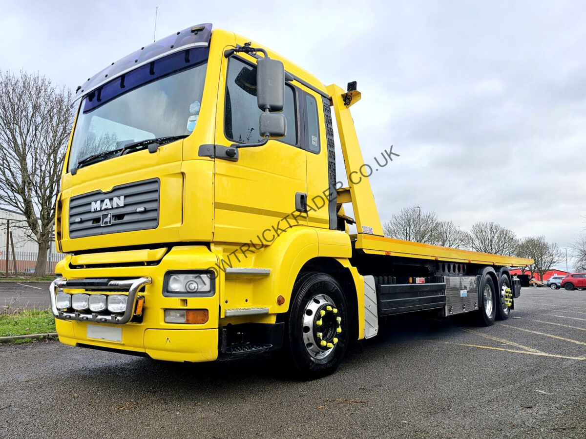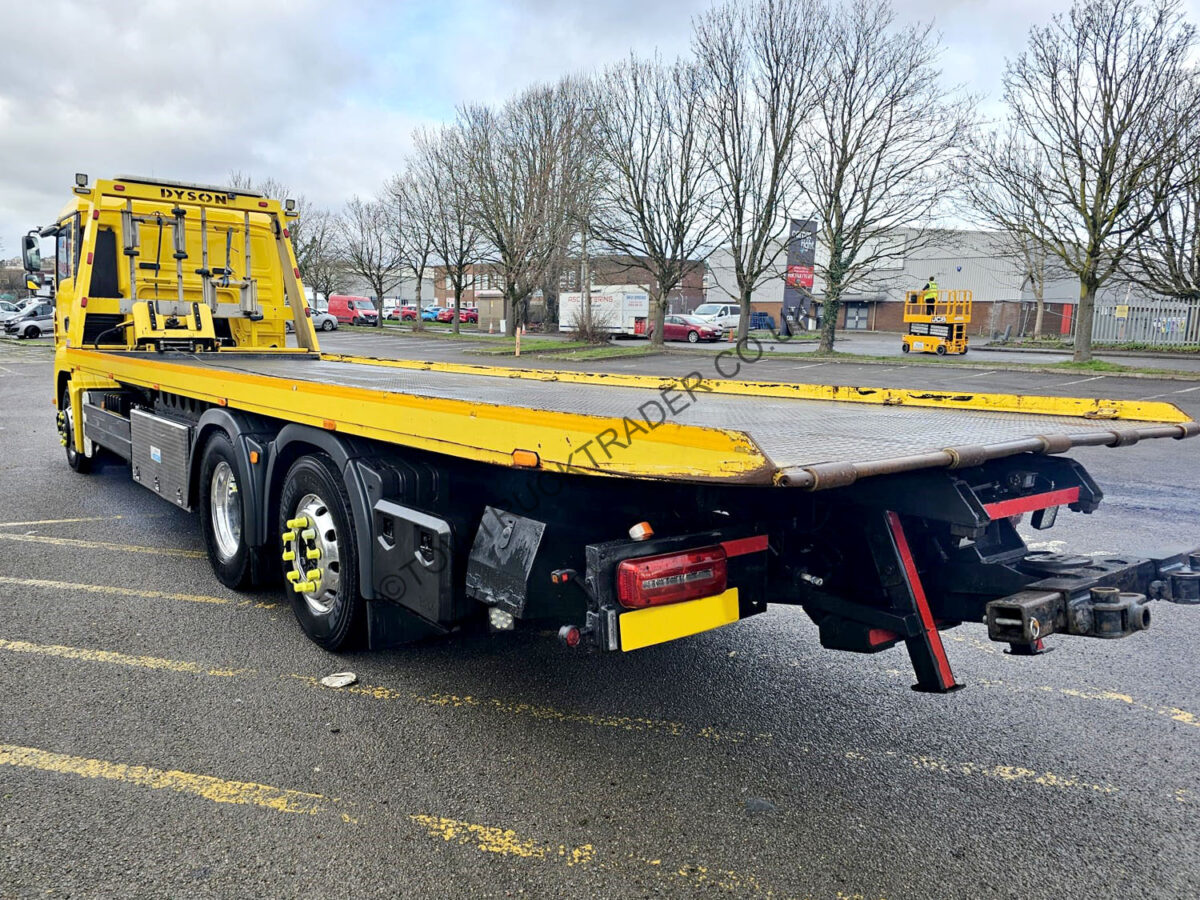 Fitted with Roger Dyson Hydraloader 10000 SLA (Super Low Approach) with independent 864 8000kg under-lift, hydraulic winch (manually sliding), 2x large stainless steel chassis mounted tool lockers, trolley jack locker, granule bin, cone carrier, adjustable wheel frames, commercial lifting forks and attachments, rear air supply, wrecker kit, LED light-bar, LED work-lights, LED strobes etc. Full air suspension, retarder, rear steer etc. Chassis ex Fire Brigade. Finance packages available (subject to status).