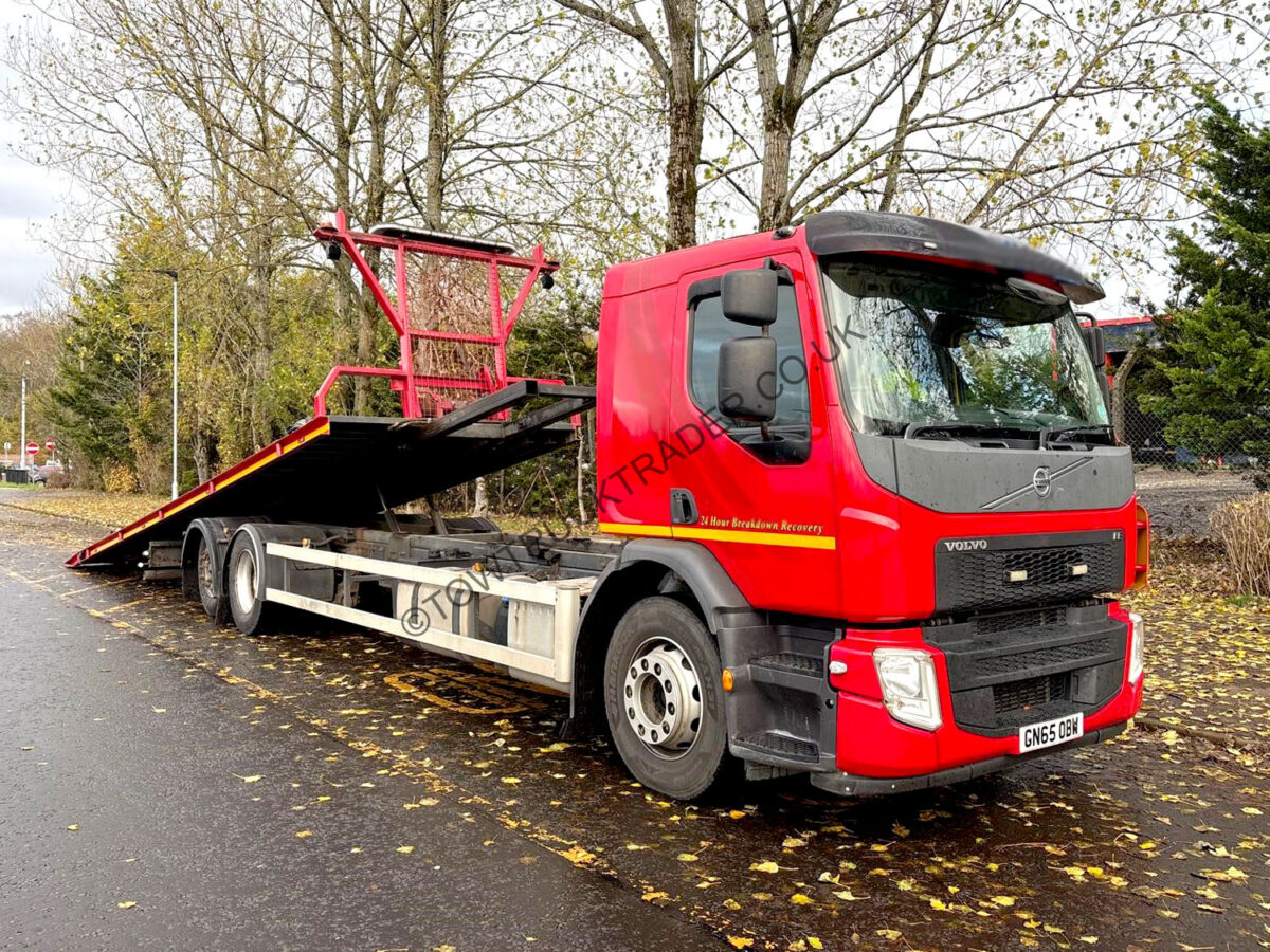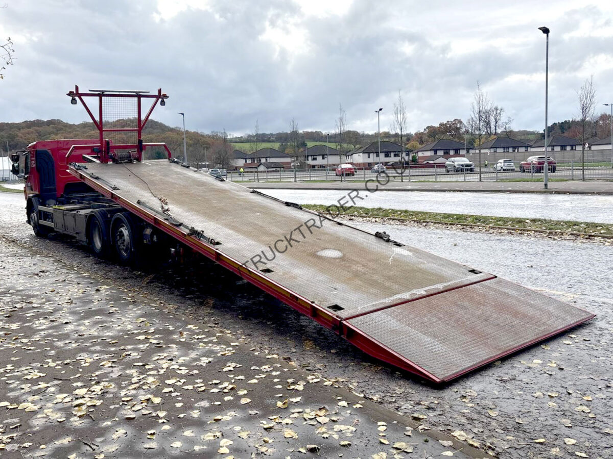 Fitted with 15000kg capacity Roger Dyson Hydraloader with tailgate (30ft bed with tailgate up), 14,000lb hydraulic Superwinch, chassis mounted tool lockers, LED light-bar, LED work-lights, LED strobes etc. Cab is yellow underneath red wrap – body painted red. Circa 465,000 km’s, MOT to 30/11/26. Finance packages available (subject to status).