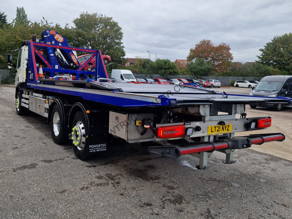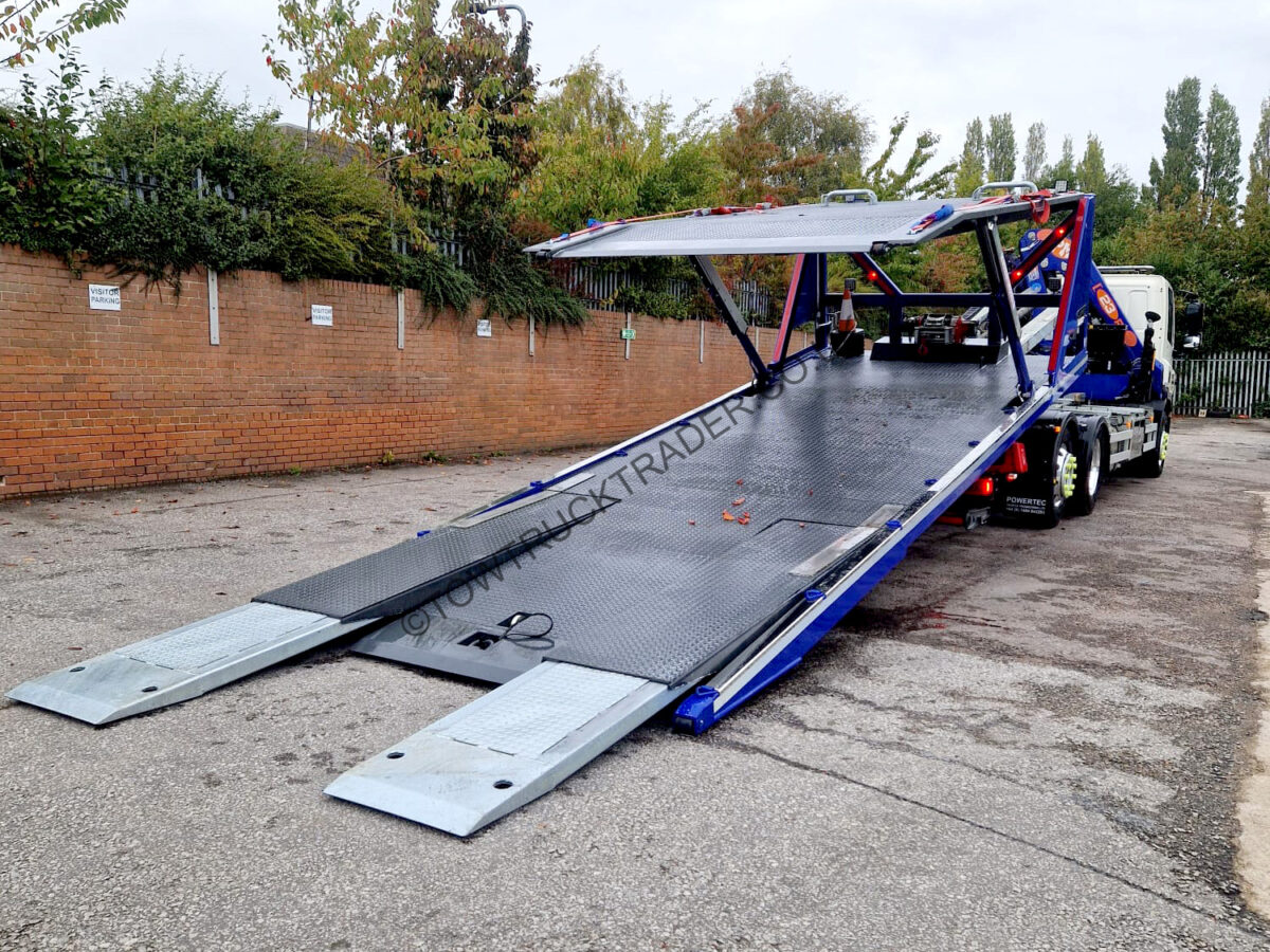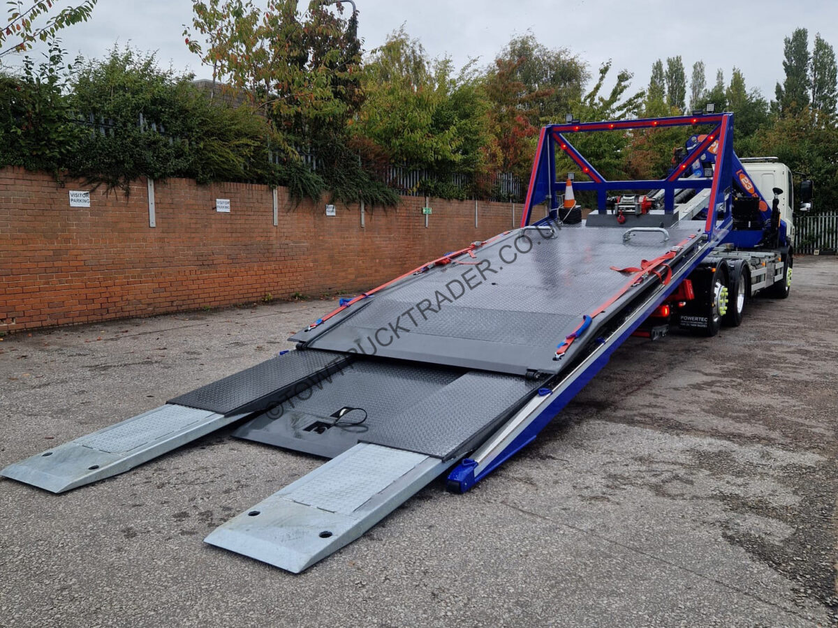 Fitted with new Powertec steel slidebed with layflat top deck and independent 2nd car lift, hydraulic power out loading ramps, hydraulic winch, full Lodar radio remote control, PM Series 23 (23t/m) lorry loader crane with 3 extensions, ProLux BTA-A 3000kg WLL spreader bar, stainless steel chassis mounted tool lockers with built in shelves, wrecker kit, LED light-bar, LED work-lights etc. Rear steer axle, sat nav, air con, camera system etc. Only 19,000 miles from new, MOT to 31/05/26. Call Paul on 07789 870739 for more details.