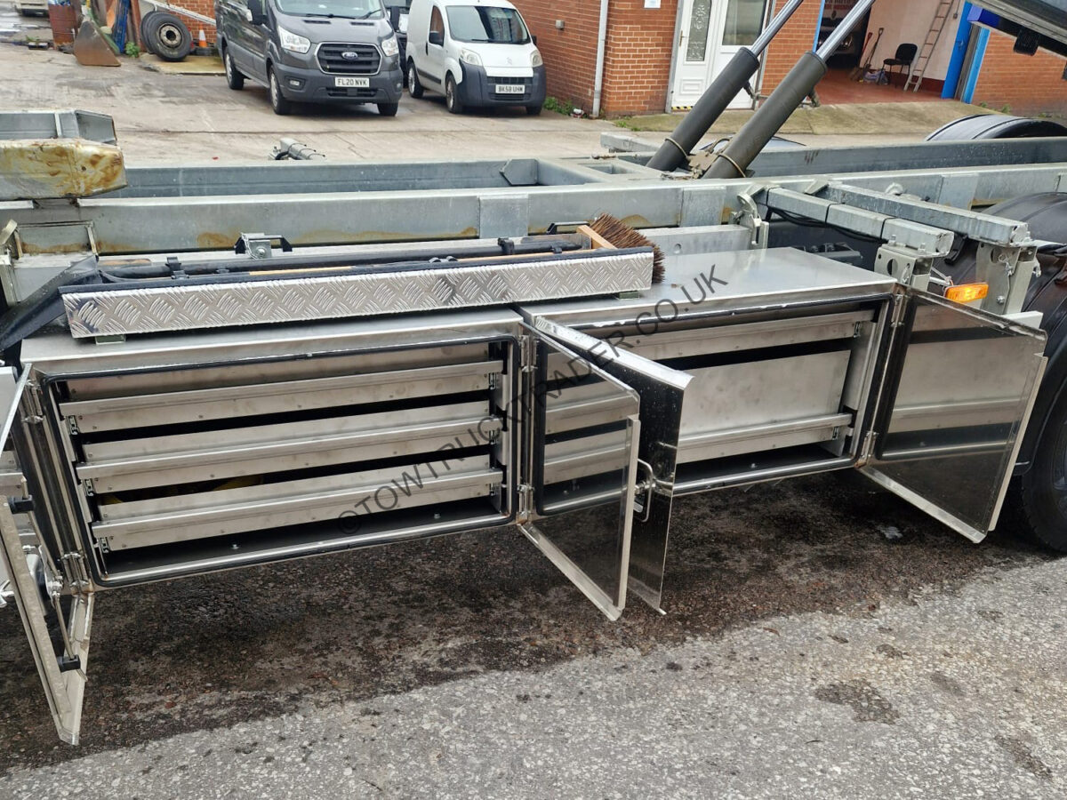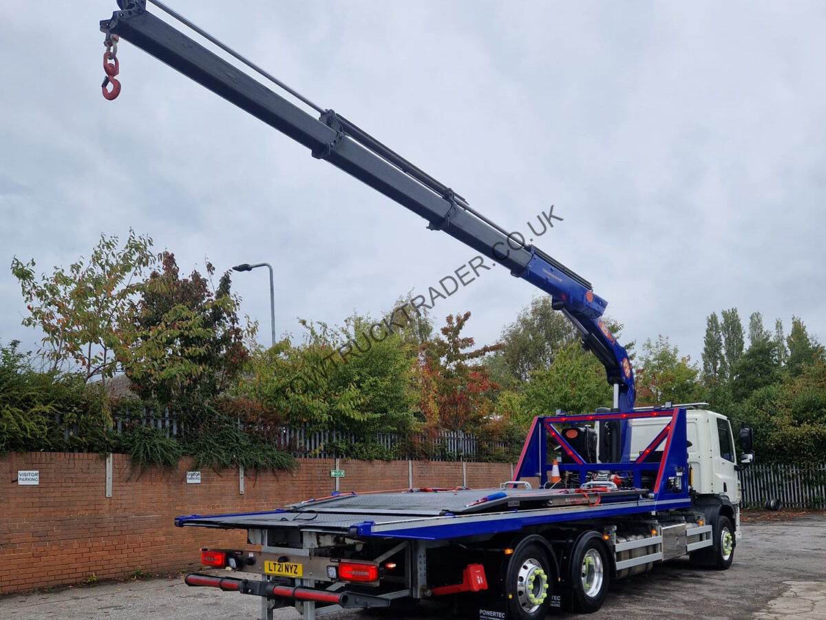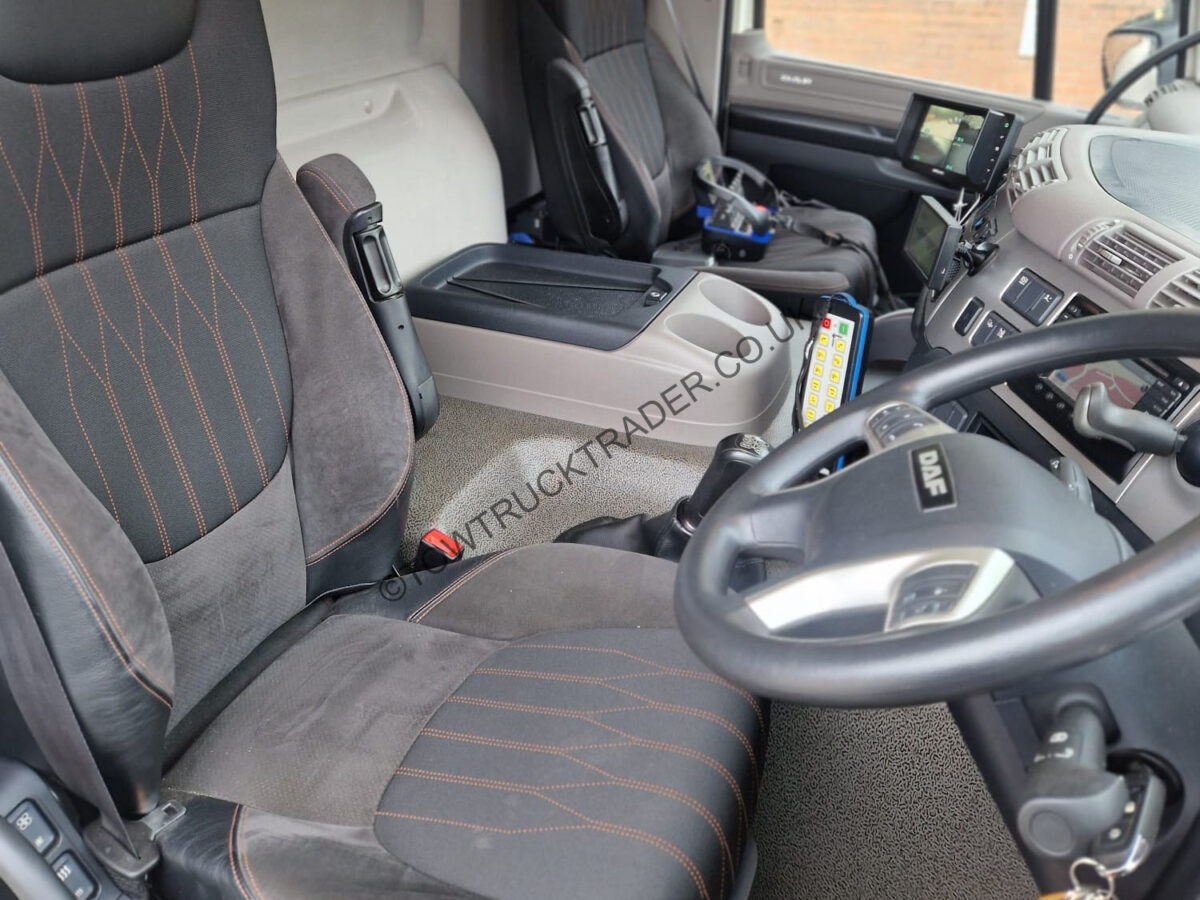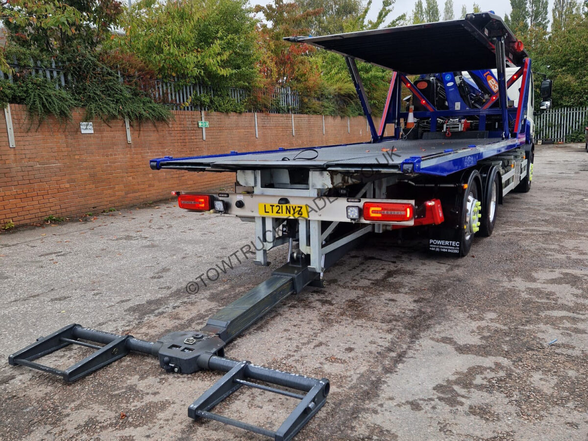 Fitted with new Powertec steel slidebed with layflat top deck and independent 2nd car lift, hydraulic power out loading ramps, hydraulic winch, full Lodar radio remote control, PM Series 23 (23t/m) lorry loader crane with 3 extensions, ProLux BTA-A 3000kg WLL spreader bar, stainless steel chassis mounted tool lockers with built in shelves, wrecker kit, LED light-bar, LED work-lights etc. Rear steer axle, sat nav, air con, camera system etc. Only 19,000 miles from new, MOT to 31/05/26. Call Paul on 07789 870739 for more details.