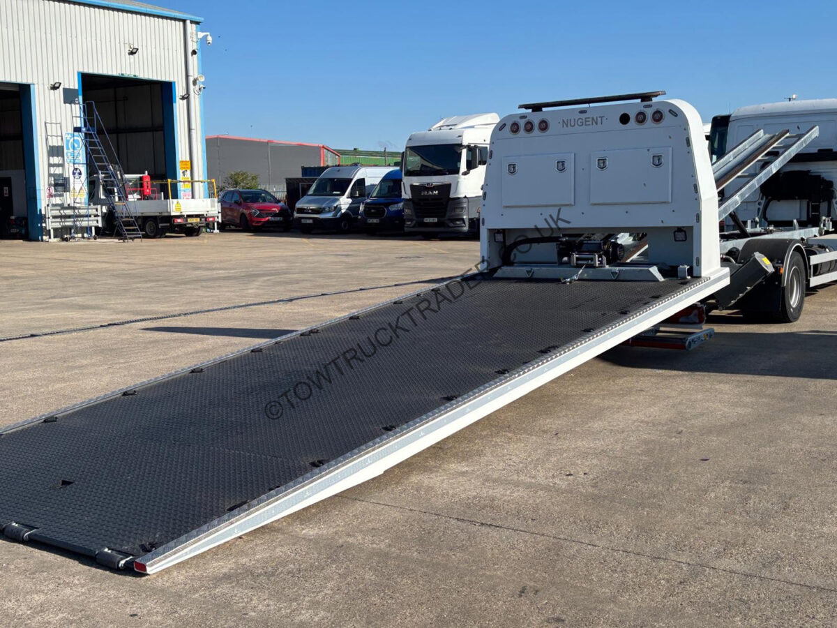 Fitted with Nugent 5000kg steel SLA with 2500kg independent 2nd car lift, 8000lb hydraulic sliding winch, full radio remote control,  LED light-bar, LED work-lights, flyer mounted lockers, chassis mounted tool lockers, sun visor, rear air suspension, 8 speed automatic transmission etc. Full 3 year warranty on the chassis, 1 year warranty on the body.  Alloy wheels, LA light-bars with Lazerlights, air horns etc. can be added at extra cost. Finance packages available (subject to status).