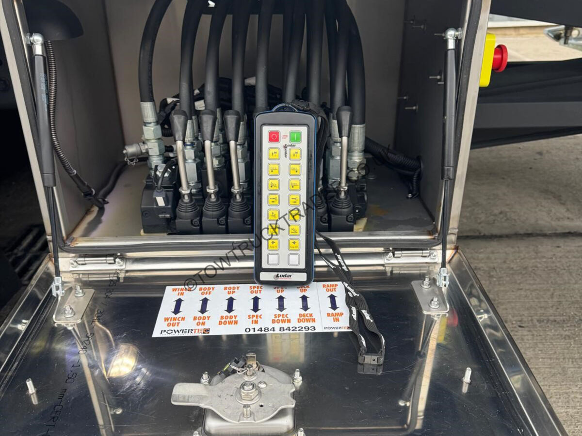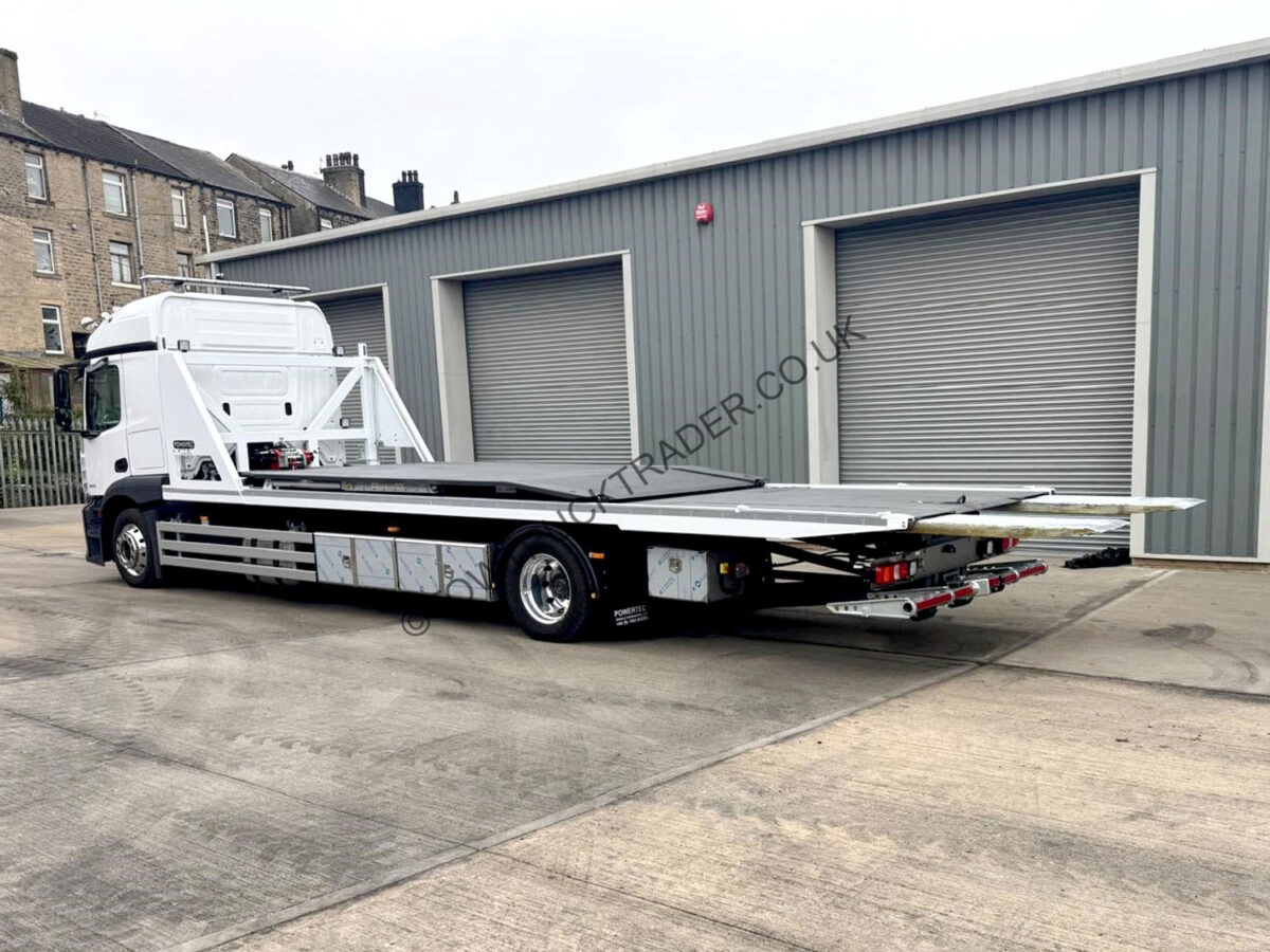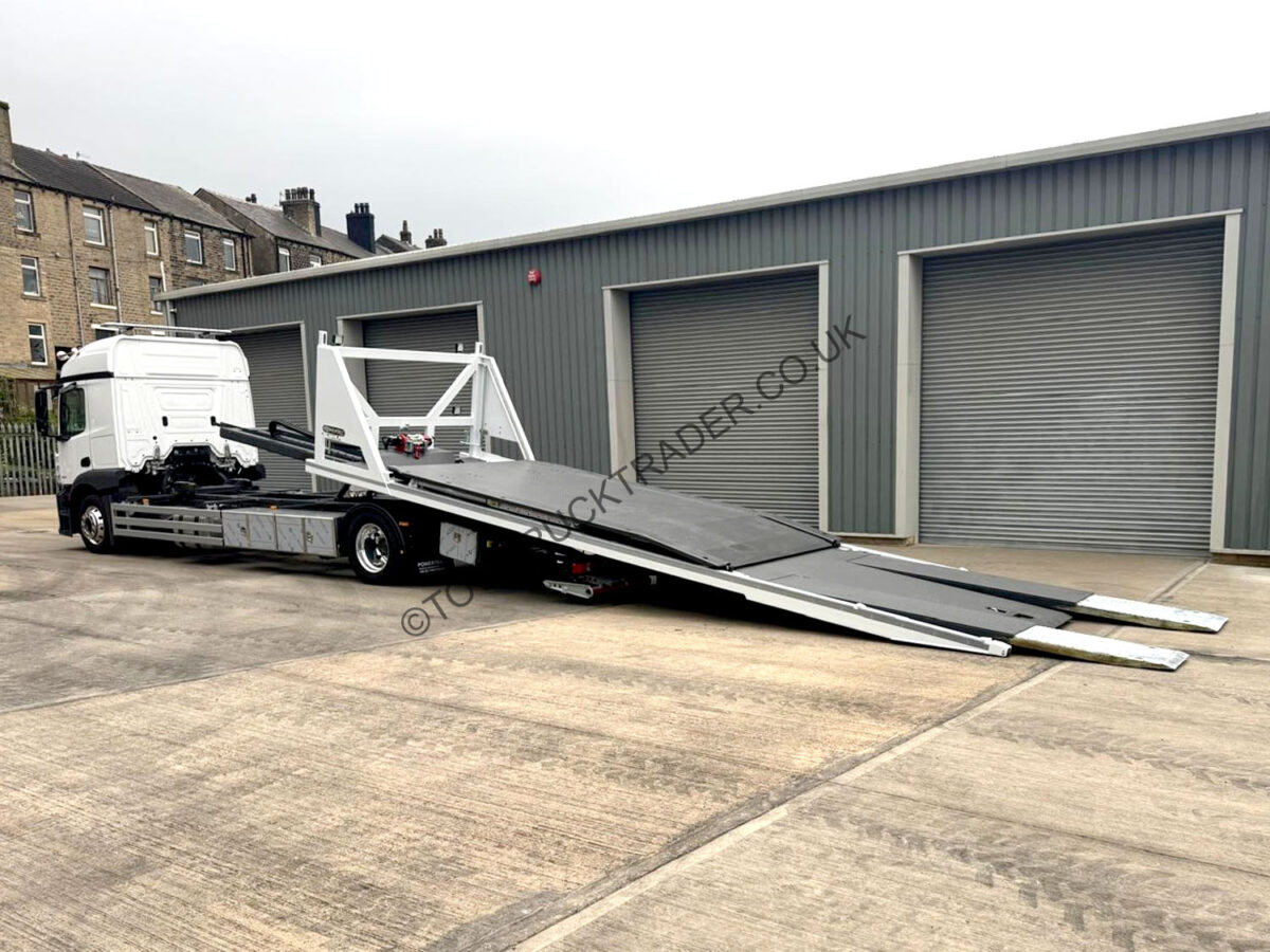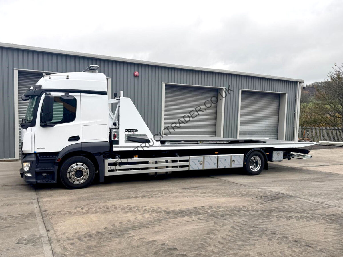 Fitted with Powertec 8000kg capacity (29ft) steel slidebed with 2500kg layflat top deck and 2500kg independent 2nd car lift, load bearing power out ramps, hydraulic winch, full Lodar radio remote control, 6x stainless steel chassis mounted tool lockers, full width LED light-bar, LED work-lights, LED strobes front and rear, side winching post, towbar attachment etc. Mercedes rear seat conversion for 4 passengers with bunk above (ideal for combination of club work/distance work), lowline chassis with full air suspension – for excellent loading angle, Alcoa alloy wheels, air horns, sat nav etc. Very smart truck – ready to be registered in your name! Finance packages available (subject to status).